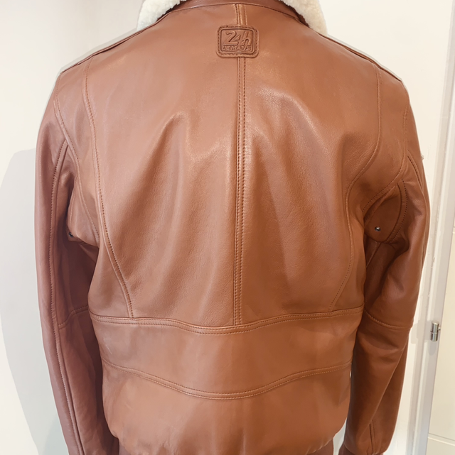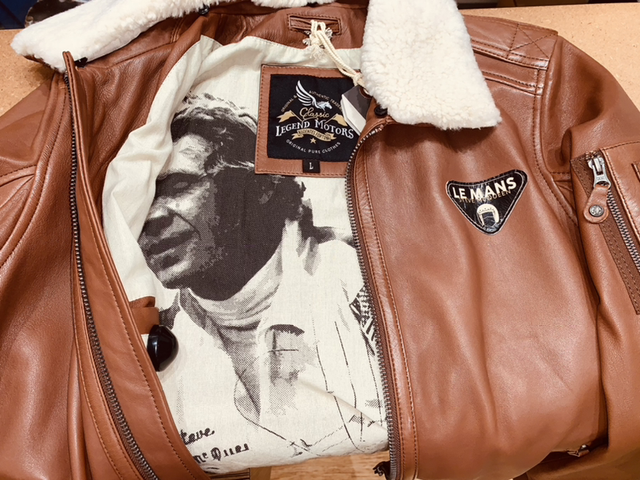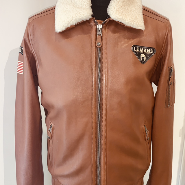 Veste en cuir d’agneau avec tannage végétal de la marque allemande Mainpol, série Steve Mc Queen les 24 heures du Mans 1971, 2 poches zippées extérieurs, 2 poches intérieurs, 1 poche zippée sur le bras gauche, col fourrure mouton amovible